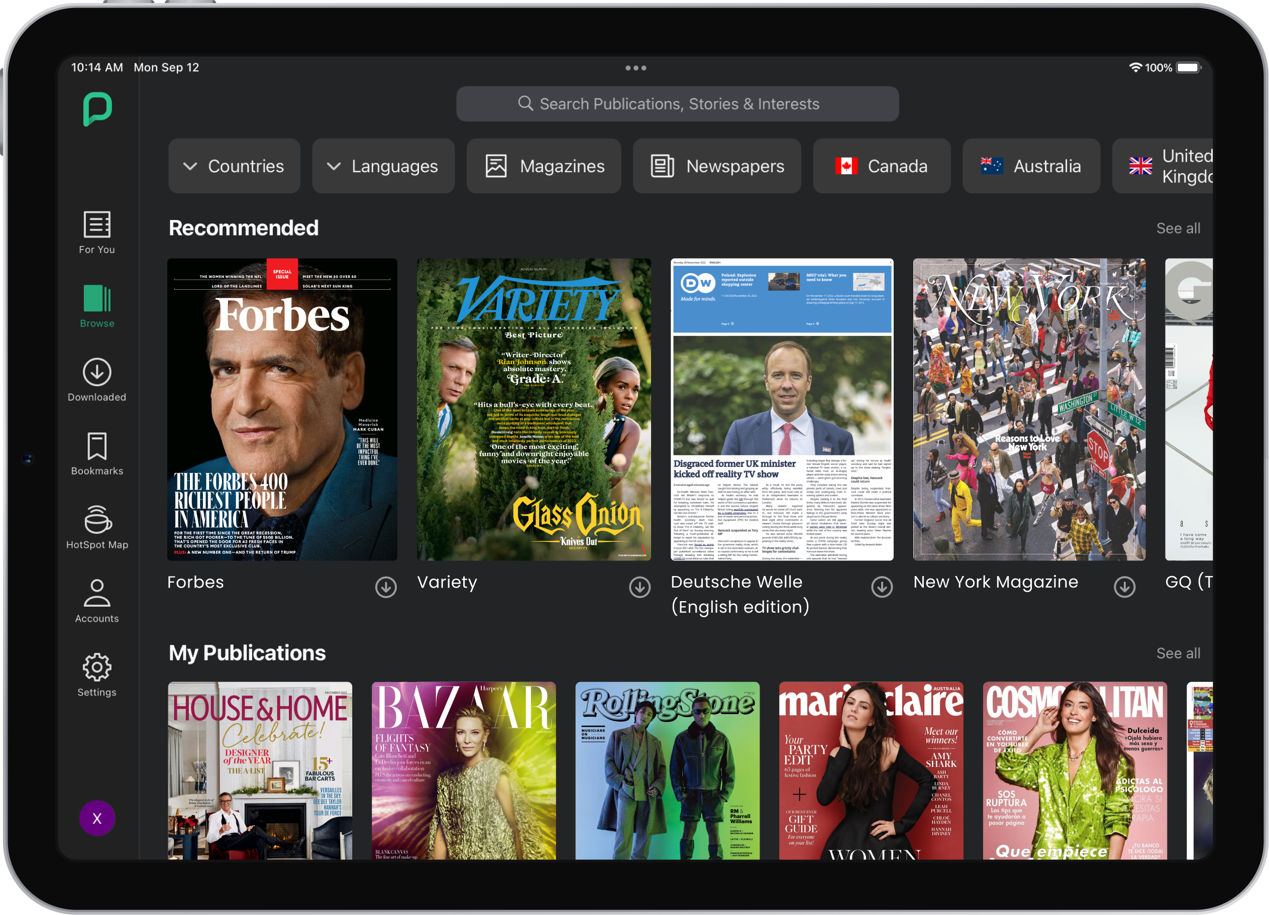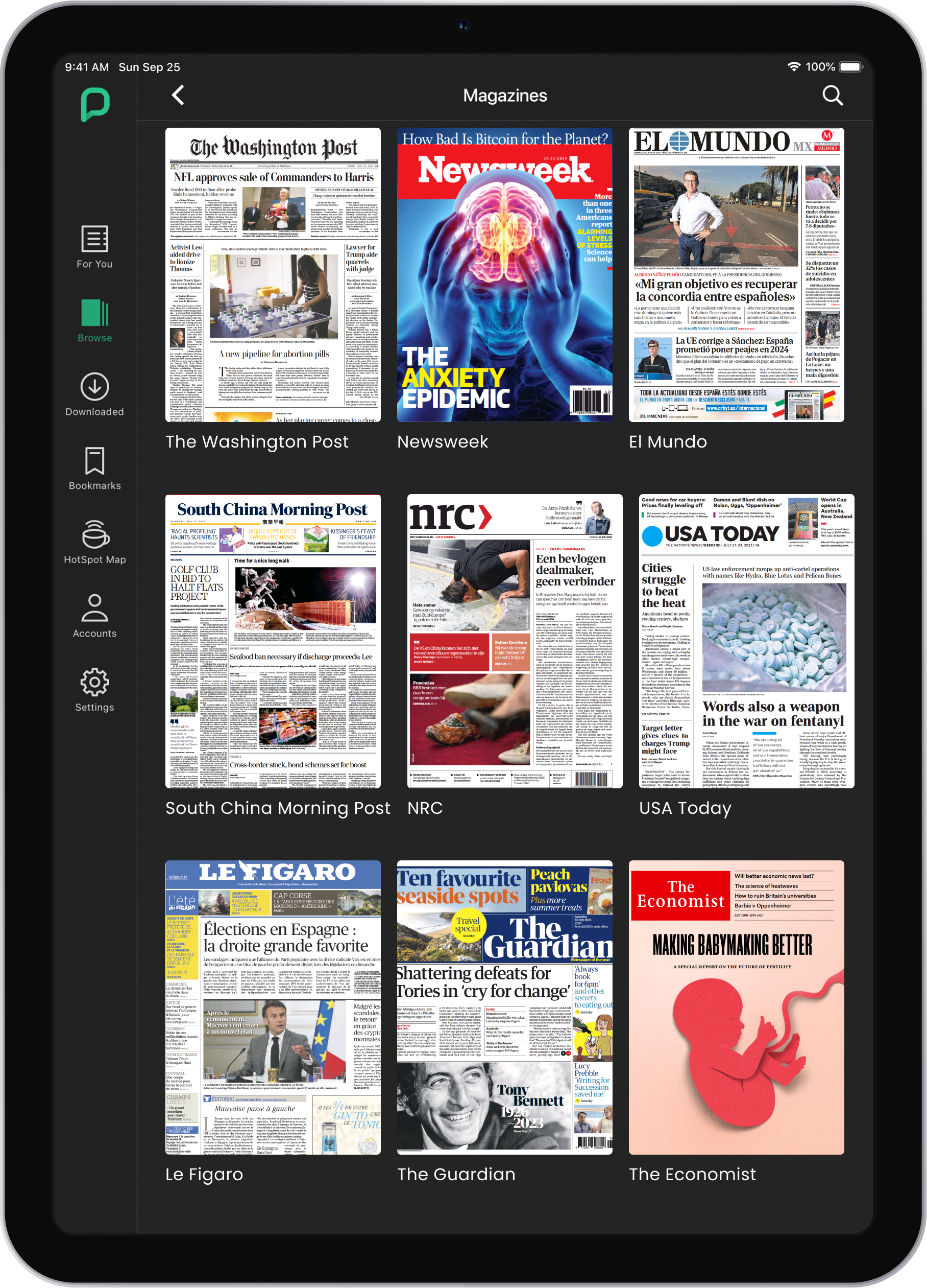 Ebenfalls enthalten sind Magazine wie z.B. die französische Vogue, die italienische und französische Cosmopolitan, die US-amerikanische Newsweek, der Rolling Stone, das Wirtschaftsmagazin The Economist, National Geographic, Smithsonian Magazin, Architectural Digest sowie zahlreiche Lifestyle- und Special Interest-Titel.